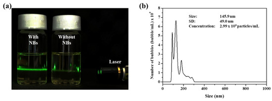 In this study, a previously patented device was used to produce the NB oil. This device constitutes of oil tank, generator, oil pump and gas pump. As oil and air that were stored in the oil tank circulate through the device by the pump, the gas-liquid mixture continuously collides with the structure in the generator to produce the NBs. As shown in Figure 1a, the generated NB oil shows a different phenomenon compared to the pure oil under the green light laser irradiation. NBs dispersed in the oil scatter the light and lead to the Tyndall effect, whereas the pure oil does not show a special phenomenon. NBs were further confirmed by NTA to measure the size and concentration. The enerated NB oil was diluted for accurate analysis because the high density of the NBs leads to interference between the light scattered by the NBs during the measurements. The concentration and size of the NBs were 2.99 billion/mL and 145.9 nm (Figure 1b).