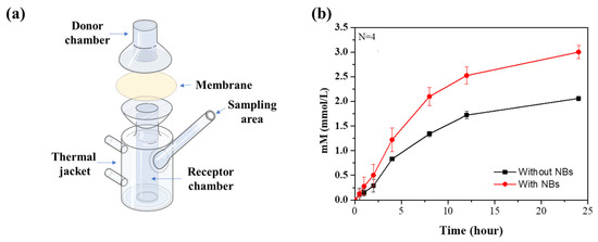 The use of animals in dermal delivery testing in the field of cosmetics has been forbidden in recent years, and various experiments are being replaced with non-animal methods [33]. In particular, the Franz cell experiments are proposed as a reliable alternative to animal testing for skin absorption testing [34,35,36,37,38]. In this experiment, the Franz cell was used to confirm the skin delivery effect of the active ingredients. The Franz cell consists of two compartments (donor and receptor chambers) and a membrane is fitted between the chambers to form a passageway for the active ingredient (Figure 2a). The active ingredient can be delivered to the receptor chamber only through the membrane. Nile red was chosen to observe the active ingredient delivery and the concentration can be measured by fluorescence. The NB oil containing the Nile red was loaded into the donor chamber, and the receptor chamber was filled with aqueous ethanol solution (40% v/v), which has a high solubility of Nile red, thus preventing the precipitation. Aliquots (100 μL) were extracted from the receptor chamber to confirm the amount of Nile red that was delivered, and that the same volume of the ethanol aqueous solution (40% v/v) was added to maintain the volume of solvent in the receptor chamber. The change in the concentration of Nile red according to the addition of the solvent was corrected through the calculation. Aliquots collected from 0.5, 1, 2, 4, 8, 12, and 24 h at room temperature were analyzed using a microplate reader, and those results were calculated to the concentration (Figure 2b). Strikingly, a higher concentration of Nile red was observed in the presence of NBs than in the absence of NBs. After 24 h, the final concentration of Nile red was 2.06 mM in the absence of NBs and 3.00 mM in the presence of NBs, which was about 1.45 times higher (Table 1). This improved delivery effect is thought to be due to the high Brownian motion of the NBs, which increases the diffusion of the active ingredient and the charge balance effect of the NBs, which improves the movement of the active ingredient in the membrane.
