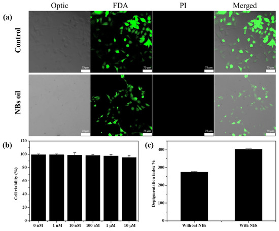 To further demonstrate the biocompatibility of our novel system, in vitro experiments of the pure NB oil and the NB oil containing α-bisabolol with the B16F10 melanoma cell were undertaken. A MTT assay was performed to analyze the cell viability after incubation for 24 h with the NB oil that contained the different concentrations of α-bisabolol. The developed method shows nontoxicity at all concentrations and in the pure oil (Figure 3b). In addition, the B16F10 cells were incubated with the NB oil to observe the cell viability using confocal. After incubation, the cell line was treated with FDA (green) for staining live cells and PI (red) for staining dead cells. As shown in Figure 3a, it was confirmed that most of the cells were live in the presence of the NB oil, which was not significantly different from that in the absence of the NBs. This result suggests that the NB oil has a high biocompatibility due to the use of only the solvent and the active ingredients; this means that it can be a safe system for the dermal delivery of various ingredients. After successfully demonstrating the delivery experiments of Nile red, a delivery test was further conducted using α-bisabolol, which is a representative depigmenting ingredient, to inhibit melanin synthesis related to hyperpigmentation. The B16F10 melanoma cells were treated with aliquots that were collected from the receptor chamber after 12 h, and the melanin concentration was measured using the microplate readers to calculate the depigmenting index [48]. The B16F10 melanoma cells, one of the skin cancers, produce melanin when incubated with α-MSH. However, when α-bisabolol, which inhibits the enzymes involved in melanin production, is applied to the cells, melanin production is reduced. Therefore, the amount of delivered α-bisabolol is estimated by comparing the calculated depigmenting index. The depigmenting index with both aliquots collected in the presence of the NBs shows that the depigmenting index was significantly increased to 400% by the delivered α-bisabolol, whereas a relatively small increase in the depigmenting index to 120% was observed with the aliquots collected in the absence of the NBs (Figure 3c). The difference in this depigmenting index is because of the delivered amount of α-bisabolol, which suggests that the NBs enhance the delivery of the active ingredients without physical stimulation or complex processes.