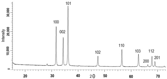 In order to obtain information on the crystallographic and chemical structure, along with physical characteristics, of biogenic ZnO NPs, a variety of analyses were carried out. The X-ray diffractogram of the synthesized nanoparticles in Figure 2 identified ZnO phase-specific diffraction peaks at 2θ = 32.54° (110), 35.58° (002), 38.86° (200), 40.43° (112), 48.57° (−202), 53.65° (020), 58.39° (202), 61.57° (−113) and 68.07° (113) [37,38,39]. The defined planes were in accordance with the JCPDS file (JCPDS: 01-007-2551) corresponding to the wurtzite structure of ZnO, which consists of two interpenetrating hexagonal close packed sublattices (symmetry group P62mc (186)). According to Equation (1), the nanoparticles consisted of a single ZnO phase (100%). Using the Scherrer equation, the average size of the synthesized zinc oxide nanoparticles was calculated as 44.6 ± 5 nm. The change in the full width at half maximum (FWHM) value of the main diffraction lines on X-ray diffraction patterns depended directly on the degree of crystallinity (DC) of the samples. The width of the registered FWHM lines was calculated by approximating the lines on the diffractogram with the necessary number of symmetric pseudo-Voigt functions, which, in the long run, allowed us to characterize the perfection of the crystalline structure and to evaluate the DC [36,40]. The degree of crystallinity of biogenic ZnO was calculated to be 91.2%.