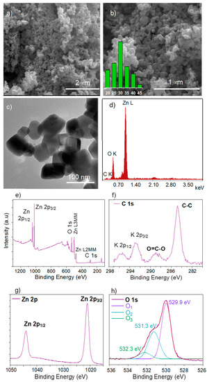 Electron microphotographs at 40,000× (a); and 80,000× magnification (the inset size distribution histogram was calculated from SEM analysis at 100,000× magnification) (b). TEM image (c) and Energy dispersion spectrum (EDS) of ZnO nanopowders (d). X-ray photoelectron spectroscopy of ZnO nanoparticles: survey wide spectrum (e) and C 1s (f), high-resolution spectra of Zn 2p (g) and O 1s (h).