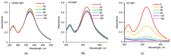 Figure 4a–c shows the spectroscopic monitoring of the optical density of AY degradation reaction under different light sources. Using the maximum absorbance at 373 nm in Formula (2), the calculated variation in dye degradation efficiency, depending on reaction time (Figure 4d), demonstrated that the highest efficiency of biogenic ZnO nanoparticles was observed when using UV-light. At 60 min after the beginning of the reaction, more than 95% of the initial dye was degraded under UV-light, while only 13.2 and 6.2% of AY were removed from the reaction mixture when sunlight and visible light were used for the same period of time, respectively.