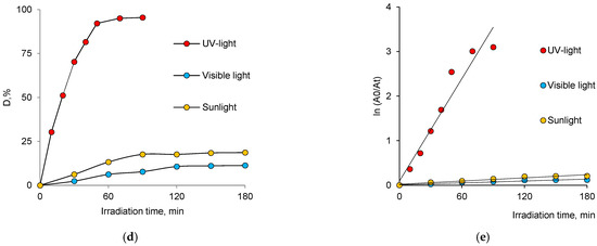 Absorption spectra of AY (1.0 mg/L) as a function of time in the presence of ZnO oxide nanoparticles (dye concentration—10.0 mg/L, loaded catalyst—50 mg) using visible light (a), sunlight (b) and UV-light (c), dye degradation efficiency (D, %) under different light sources (d) and Langmuir–Hinshelwood plot for the degradation of AY under different light sources (e).