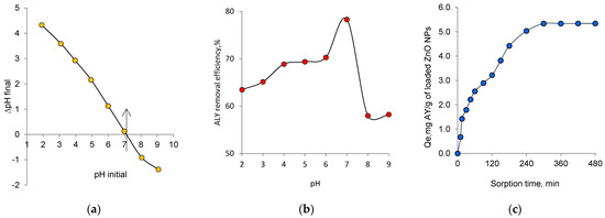 It has been shown in detail in the previous section that ZnO nanoparticles catalyze the photodegradation of AY under an applied light source, especially UV light. Besides a degradation process, ZnO nanoparticles may also be effective in adsorption of AY, due to their high surface area. Therefore, in addition to their catalytic activities, in this section, we examined the performance of the biogenic nanoparticles we synthesized in the removal of AY by sorption. The point of zero charge pH (pHPZC) defines the pH of the solution at which the net surface charge of adsorbent is equal to zero. The study of pHPZC is important to identify the adsorption mechanism and, thus, to explain the nature of the interactions [63]. Figure 8a shows the plot of pHfinal versus pHinitial. It can be seen from this figure that the pHPZC value obtained for biogenic ZnO NPs was approximately 7.1, which was consistent with the value obtained by Katarina et al. [64]. Meanwhile, Leiva et al. [17] and Chauhan et al. [65] reported pHpzc values of 6.21 and 7.5 respectively. The differences observed with existing studies might be a consequence of the synthesis method, the aggregation of NPs, and the presence of impurities, among other factors [17]. The effect of solution pH on dye adsorption is presented in Figure 8b. The neutral condition favored AY removal, and the maximum adsorption was observed at pH 7.0 (78.3% removal after 120 min), consistent with the previously reported optimum pH [59].