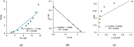 Besides photocatalytic removal, one of the most popular and cost-effective techniques for the effective treatment of various water contaminants (dyes, heavy metals ions, pesticides, etc.) is adsorption. The correct understanding and interpretation of adsorption isotherms is a key step for the development of new types of effective adsorbents [70]. The equilibrium in the adsorption system depends on the nature of the interactions between adsorbent and adsorbate [71]. Well-known adsorption models, namely Langmuir, Freundlich and Dubinin–Radushkevich (DR), describe these interactions in different ways. The linearized equation forms of all studied isotherm models and the determined isotherm parameters are presented in Table 4. The Langmuir model describes the equilibrium between the adsorbate and adsorbent, where the adsorbate adsorption is limited to one molecular layer at, or before, a relative pressure of unity is reached [72]. Langmuir parameters b and Q0 were calculated from the intercept and slope of the linear plot presented in Figure 9a.