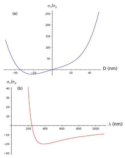 Figure 2 shows functional dependence given by Formula (4) on an independent variable with fixed , , and corresponding to theoretical SPR (blue curve, (a)) and on an independent variable with fixed , , and also corresponding to theoretical SPR (red curve, (b)).