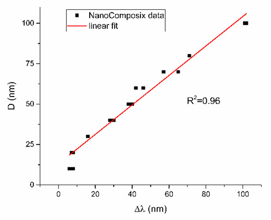 In the obtained formula for the redshift constant there is no explicit dependence on the size or size distribution of nanoparticles in colloidal solution, only on dielectric constants, which are incorporated in and . Since it is known in theory that redshift depends on the size and size distribution of nanoparticles, these variables must be hidden in the ratio . Dependence of on is well known to exist [21] and was checked on NanoComposix data (Nanoxact and BioPure nanoparticles). As can be seen in Figure 3, the dependence of reported TEM diameters on the difference between experimental and theoretical SPR wavelength is linear and shown to be: for NanoComposix data.