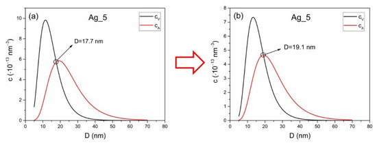 where is the mode diameter of nanoparticles in a colloidal solution. Here, it must be stated that the integral in numerator (13) cannot be analytically solved, so the final analytical form is the result of numerical testing. In Figure 4a, volume and absorbance concentrations as a function of diameter are given. Concentrations are calculated without use of redshift function using (3b) for volume concentration and (9) for absorbance concentration with respect to (10) for conservation of total concentration. In Figure 4b, volume and absorbance concentrations as a function of a diameter are given with use of redshift function. Relation (3b) was used for volume concentration and (3e) for absorbance concentration with respect to (10) for conservation of total concentration. It can be seen that intersection of and differ in Figure 4a,b. The diameter when is shifted from volume average to mode diameter when redshift function is applied.