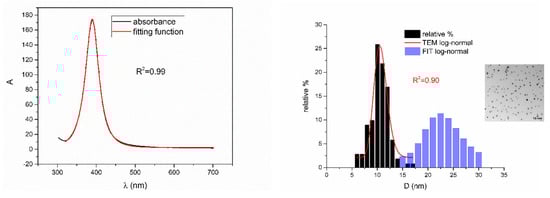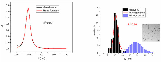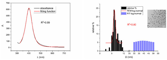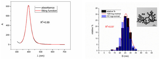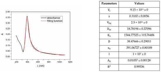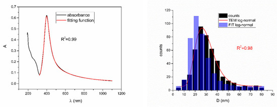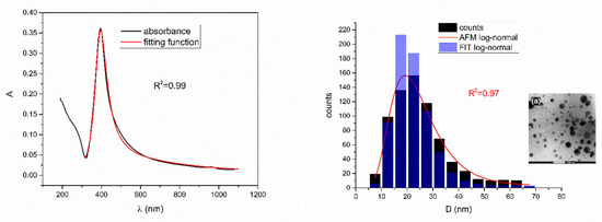 Pulsed laser ablation in liquids (PLAL) is a versatile physical technique that uses laser radiation to evaporate different materials immersed in liquids in order to get nanoparticles in the relevant size range up to 100 nm [1]. Laser ablation as well as thermal evaporation and condensation, atom deposition and condensation fall under the category of gas-phase preparation methods for nanoparticles’ synthesis. On the other hand, there are liquid-phase methods like chemical reduction, hydrolysis, photolysis, sol-gel methods, and mechanical like milling, ultrasound, and spraying [2]. Silver nanoparticles obtained by laser ablation in liquids and chemical techniques differ mainly in the width of size distribution [3] and need for stabilizing agents to keep the nanoparticle solution stable from agglomeration [4]. While the advantage of laser synthesis is the purity of the method, control of final nanoparticles’ sizes is not yet achieved [5] like in chemical reduction methods [6], which, on the other hand, have disadvantages of chemical impurities. The importance of silver nanoparticles grows as they show excellent properties and applications in catalysis [7], optoelectronics [8], energetics [9], sensorics [10], toxicology [11], nanomedicine [12], cancer nanotechnology [13], antibacterial [14,15], etc. In all of the mentioned applications, the size of statistically distributed nanoparticles has a major role in efficiency and capacity of a given field [16]. Beneficence of localized surface plasmons in the visible part of the spectrum and damping frequency above SPR frequency [17] make silver nanoparticles even more useful, for instance in optical imaging and bio-labelling of molecules. Colorimetric variations of colloidal solution of silver nanoparticles are a direct indicator of chemical activity as well as the size of nanoparticles, since SPR wavelength is directly dependent on the size of nanoparticles [18]. Conventional characterization techniques for sizes and concentrations of synthesized nanoparticles obtained either by laser or chemically involve electron microscopy, atomic force microscopy, dynamic light scattering, resistive pulse sensors, ICP-MS, XRD, etc. [19]. Those techniques are both time consuming and expensive, so a cheap and easily accessible alternative is needed. As was shown in [20], UV-Vis spectroscopy in combination with optical microscopy suffices for determination of the size of nanoparticles in a colloidal solution. Since that model was based on absorbance at SPR wavelength and the volume of the crater left after laser ablation, it gave the characteristic diameter of nanoparticles in a colloidal solution. The approach developed in this work is also based on the Beer–Lambert law although expanded due to redshift of scattered wavelengths and is incorporated into fitting function. Since the fitting function considers entire UV-Vis spectra excluding the interband region where the Beer–Lambert law does not hold, it may serve as a verification method for diameters of nanoparticles obtained by a simple analytical model reported in our previous work [20]. Although there are approaches to determine the size distribution of nanoparticles by UV-Vis spectroscopy solely, they include fitting constants that are not physically defined [21]. The fitting function developed in this work has all parameters physically defined and verified by independent TEM measurements with a given size distribution. Motivation and the need for a fitting function for UV-Vis spectra in the nanoscale range primarily serves the purpose of excluding the need for electron microscopy and additional characterization methods or techniques in order to obtain relevant physical properties of silver nanoparticles in colloidal solutions. Data used in the analysis were the following: five UV-Vis spectra of laser-synthesized nanoparticles measured by authors [20], 25 UV-Vis spectra from commercially available data from the company NanoComposix (San Diego, CA, USA), out of which 10 were NanoXact nanoparticles with citrate surface [22], 10 were BioPure purified from all reactants [23], five were Econix with PVP (polyvinylpyrrolidone) surface [24], and three were randomly chosen from independent authors [25,26,27].