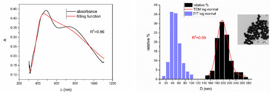 As can be seen from Table 1, fitted diameters are in very good agreement with ones measured by electron microscopy. As can be seen in Table S1 in Supplementary Materials, deviations start to arise for diameters smaller than 20 nm and larger than 90 nm, which is expected due to the fact that Mie theory in dipole limit cannot explain new phenomena in UV-Vis spectra above 90 nm while quantum confinement plays a role when the size of nanoparticles becomes significantly smaller than electron mean free path (~50 nm for Ag) [29]. Therefore, the developed fitting function has a range of applicability, which is 20–90 nm. In Table 2, examples of colloidal silver nanoparticles where the fitting function does not reproduce measured values are shown.