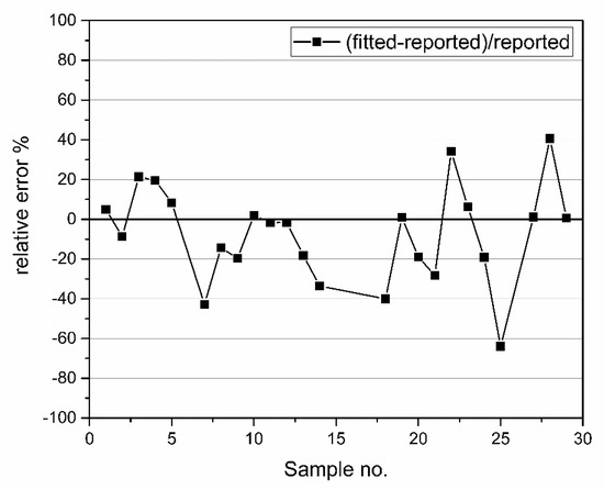 Comparison between relative error of fitted to reported concentration for the set of samples given in Table S3.