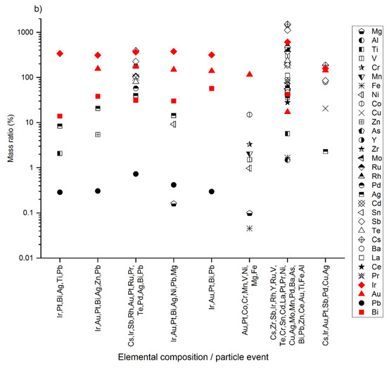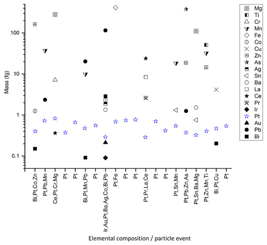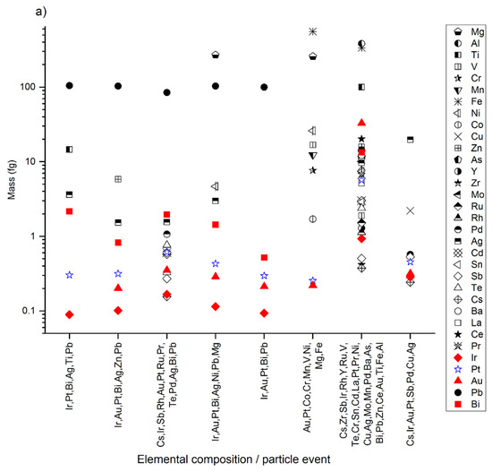 For all Pt-containing NPs detected, the masses of Pt and other PGEs (i.e., Ir, Pd, Rh, and Ru) were much smaller (<1 fg; Figure 2a) than those of, for example, Al, Mg, Ni, Pb, Ti, Zn, and V (10–100 fg; Figure 2a). Consistently, the mass ratios of Pt to PGEs were high (>0.3; Figure 2b), whereas for Pt to Al, Mg, Ni, Pb, Ti, Zn, and V, the ratios were low (<0.1; Figure 2b). In soils and sediments, Pt is generally found as Pt complexes and Pt NPs associated with mineral phases and organic matter [14,47]. The trace content of Pt and other PGEs in the detected particles might indicate that the particles contain Pt in the form of sorbed species and/or as very small Pt NPs associated with much larger particles and/or in trace amounts in host minerals.