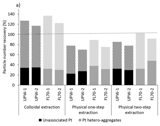 The recoveries of unassociated Pt NPs were similar for all extraction procedures. By contrast, the colloidal extraction procedure recovered between 82% and 104% of hetero-aggregated Pt NPs, while the physical one-step and physical two-step extractions procedures recovered only between 42% and 70% of hetero-aggregated Pt NPs (Figure 5a). The colloidal extraction especially targets the release and dispersion of clay particles [27,30], such as chlorite (Figure S2), resulting in the extraction of a larger number of sediment particles.