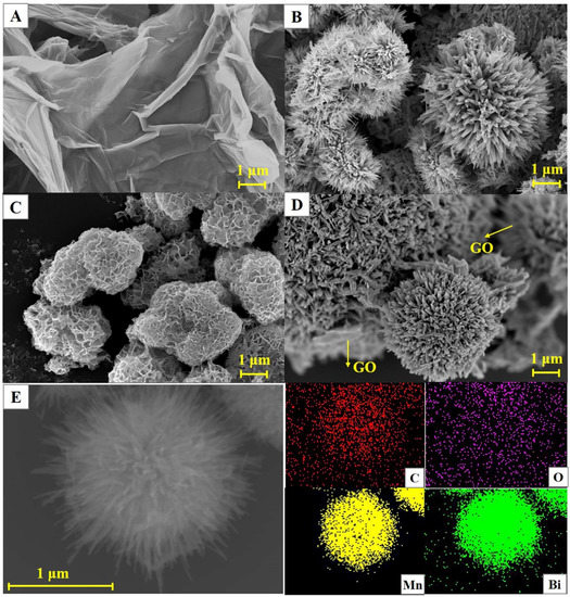 SEM images of the GO nanoflakes (A), dandelion-like α-MnO2 microspheres (B), flower-like β-Bi2O3 microspheres (C), and Bi2O3/MnO2/GO nanocomposites (D). (E) EDS mapping of the Bi2O3/MnO2/GO nanocomposites.