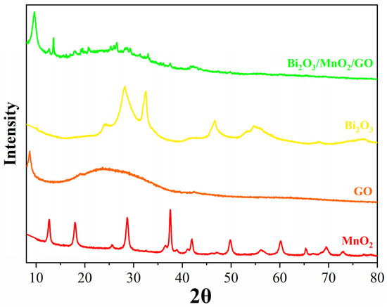 Figure 2 displays the XRD patterns of the GO nanoflakes, dandelion-like α-MnO2 microspheres, flower-like β-Bi2O3 microspheres, and Bi2O3/MnO2/GO nanocomposites. A sharp diffraction peak was observed at 2θ of 9.68° in the XRD pattern of the GO, which is attributed to the (001) crystal plane of the GO [48]. α-MnO2 nanostructures displayed distinct diffraction peaks at 2θ of 12.78°, 18.08°, 28.64°, 37.62°, 50°, 56.14°, 60.18°, and 69.54°, corresponding to the (110), (200), (310), (211), (411), (600), (521), and (541) planes of α-MnO2 (JCPDS 440141), respectively [49]. Additionally, we detected sharp diffraction peaks without any apparent impurity peaks, demonstrating that the as-prepared α-MnO2 microspheres were of high purity. Broad diffraction peaks were observed for the flower-like β-Bi2O3 at 28.00°, 32.52°, 46.32°, and 55.64°, which can be indexed to the (201), (220), (222), and (213) crystal facets (JCPDS 651209) [24]. The characteristic diffraction peaks of both the GO α-MnO2 and β-Bi2O3 can be observed in the XRD pattern of the Bi2O3/MnO2/GO nanocomposites. However, the intensity of the diffraction peaks of the α-MnO2 and β-Bi2O3 microspheres were significantly weakened, which was mainly due to the presence of a large amount of GO partially masking the diffraction peaks of the α-MnO2 and β-Bi2O3. This further confirmed that the Bi2O3/MnO2/GO nanocomposites were successfully synthesized.