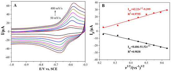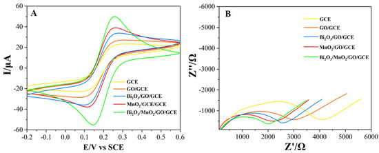 The CV curves for the different electrodes were scanned in a solution of 2.0 mM [Fe(CN)6]3−/4− and 0.1 M KCl to assess their electrochemical properties. As shown in Figure 3A, a pair of sharp and symmetric redox peaks occur at all electrodes, with an almost identical anodic and cathodic peak current (Ipa and Ipc), indicating that the redox of Fe(III)/Fe(II) is a quasi-reversible process. After the modification of the GO, Bi2O3/GO, MnO2/GO and MnO2/Bi2O3/GO, the redox peak currents were sequentially enhanced. The corresponding effective electroactive areas were also estimated based on the Randles–Sevcik equation: