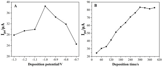 (A) The effect of the deposition potential on the Ipa of 1.0 μM of Pb2+ with the deposition time fixed at 120 s. (B) The effect of the deposition time on the Ipa of 1.0 of μM Pb2+ with the deposition potential fixed at −1.0 V.