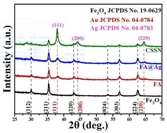 XRD pattern of Fe3O4 hollow spheres, FA, FA@Ag, and CSSN NCs.
