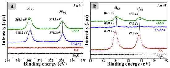 The valence of elements in CSSN NCs was determined by XPS technology. Full XPS spectra of Fe3O4 hollow spheres, FA, FA@Ag, and CSSN NCs are exhibited in Figure S3. Within detection limit of XPS, Fe 2p, O1s, Au 4f, Ag 3d, and C 1s were observed and no impurity was found. High-resolution XPS results of Ag 3d and Au 4f are reflected in Figure 3. Ag 3d spectra in Figure 3a display peaks at 368.2 and 374.2 eV with a spin-orbit splitting of 6 eV for CSSN NCs, which are attributable to characteristics of Ag 3d3/2 and Ag 3d5/2 of Ag0 [53]. As represented in Figure 3b, peaks of CSSN NCs at 84.1 and 87.8 eV with an energy difference of 3.7 eV are attributable to Au 4f7/2 and Au 4f5/2 of Au0 [54,55]. An interesting phenomenon is that the binding energy of Ag 3d as well as Au 4f changes slightly with the incremental introduction of noble metals. The positions of Ag 3d peaks of CSSN NCs are blue-shifted compared with FA@Ag NCs, and the positions of Au 4f peaks are red-shifted compared with FA@Ag and FA NCs. This shift in binding energy may be ascribed to the charge transfer from metallic Au to Ag [56,57,58].