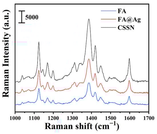 In order to directly evaluate the SERRS performance of various substrates, BPA (10−4 M) was chosen as the target molecule and FA, FA@Ag, and CSSN NCs served as SERRS substrates to explore their SERRS-enhancing capabilities, respectively. The detailed band assignments of BPA azo products are exhibited in Table S2 [37,60]. As reflected in Figure 4, with the incremental introduction of noble metals, the SERRS intensity of BPA gradually increases and CSSN NCs exhibit the strongest SERRS sensitivity compared with FA and FA@Ag NCs. The above phenomenon is foreseeable and will be discussed in detail below.