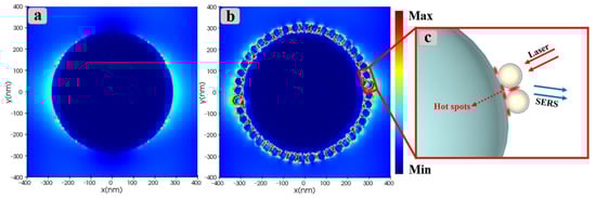 As mentioned above, the widely accepted theory for SERRS enhancement mechanism is EM mechanism, which derives from LSPR excitation of noble metal nanocrystals [61,62,63]. Compared with FA NCs, the surfaces of FA@Ag NCs are almost completely covered with Ag shells, which have better LSPR effect than Au, so it is reasonable that SERRS performance of FA@Ag NCs is somewhat better than that of FA NCs. In addition, strong electromagnetic fields will be excited in/between nearby noble metals because of the coupling effect and thus the SERRS signal intensity of target molecule can be significantly enhanced in hot spot regions [64,65,66]. Consequently, increasing the quantity of hot spots is an effective method to enhance the SERRS activity. To reveal why CSSN NCs have the highest SERRS enhancement, a FDTD theoretical algorithm was employed to visualize the distribution of electromagnetic field. As presented in Figure 5, it can be seen that more hot spots are generated on CSSN NCs. Compared with CSSN NCs, no obvious hot spots are found on the separate FA@Ag NCs (Figure 5a). A reasonable explanation is that the SERRS enhancement of FA@Ag NCs may come from hot spots generated by the aggregation of FA@Ag NCs in an actual detection procedure. As for CSSN NCs, large number of hot spots can also emerge in the region of narrow spacing between two adjacent Au@Ag nanocrystals, as shown in Figure 5b,c. In addition, there are large amounts of hot spots between Ag shells and outermost Au@Ag nanocrystals. It follows that the hot-spots effect is brought into full play through the construction of the core–shell–satellite structure. It also needs to be emphasized here that the introduction of the bimetallic Au@Ag nanocrystals is distinctly important, given that the Au@Ag nanocrystals make full use of excellent SERRS activity of Ag nanocrystals and high stability of Au nanocrystals [67,68]. Therefore, the excellent SERRS performance of CSSN NCs is attributed to a considerable quantity of hot spots generated by the core–shell–satellite structure, as well as excellent SERRS performance of Au@Ag nanocrystals.