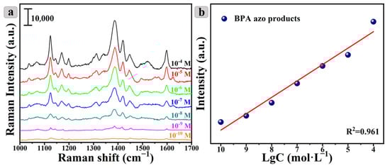 SERRS spectra of BPA azo products (from 10−10 to 10−4 M) adsorbed on CSSN NCs (a). The relationship between the SERRS intensity and concentrations of BPA azo products (b).