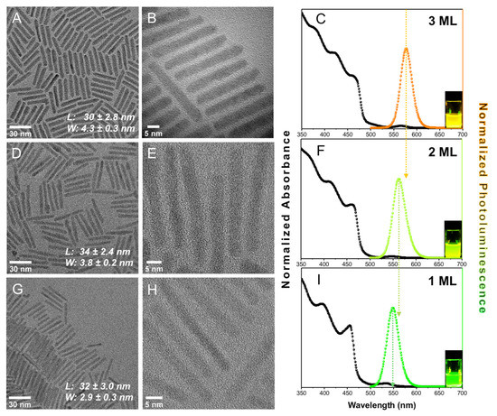 Optical characterizations of nanomaterials. TEM and UV-Vis absorption and PL spectra of 3 ML (A–C), 2 ML (D–F), and 1 ML (G–I) NRs in toluene, excitation wavelength 405 nm. The letters “L” and “W” in panels (A,D,G) are abbreviations for “length” and “width”, respectively. Insets in panels (C,F,I) show the luminescence of the different nanoparticles in solution with a glass vial.