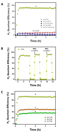 Two control experiments were conducted to validate the proposed photocatalysis cycle. For these control experiments, we focus on the mid-range 2 ML sample, which serves as a representative case. In the first control experiment (Figure 2A), each species was independently omitted. In the absence of any of the components—MV2+ (redox shuttle), Pt-NPs (H2 evolving cocatalyst), MPA (hole scavenger), and NRs (photosensitizer)—the efficiency dropped substantially. This demonstrates that the system relies greatly on each component and corroborates the successful functionality of the shuttle-mediated photocatalytic system. In the second control experiment (Figure 2B), the reaction was run continuously for the first 4 h. Afterwards, the LED was turned off, an additional aliquot of MPA was added, and the LED was turned back on after proper purging of the reaction cell. Repeated iterations showed that the efficiency never exceeds unity (IQEmax = 92%). Moreover, continuously switching the LED off/on led to complete loss/recovery of the efficiency, validating the stability of the sample and demonstrating that the reaction was light-activated. Figure S3 presents 24 h operation without replenishment of the hole scavenger.