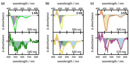 Before comparing spectra obtained at different experimental conditions, the features in the transient absorption spectrum of 1 ML upon CdS rod excitation are discussed. The spectrum is mainly characterized by three pronounced bleach features (Figure S7). These features are attributed to state-filling of conduction band electron levels [45] and can be correlated with exciton bands in the steady-state spectrum. The bleach centered at 530 nm, termed herein B3, corresponds to the bleach of the CdSe exciton transition [30,46]. The negative differential absorption with a minimum at 450 nm corresponds to two different bleach features. The sharp bleach feature at 450 nm (B1) corresponds to an exciton in the CdS rod. The shoulder at 470 nm (B2) reflects excitons located within the CdS rod, but in close proximity to the CdSe seed [30,46]. These bleach features were present in all samples when excited at 390 nm. With an increasing number of monolayers, all bleach features exhibit a bathochromic shift, e.g., the B3 bleach shifts from 530 nm (1 ML) over 545 nm (2 ML) to 567 nm (3 ML) (Figure 4), in agreement with the shifts observed for the CdSe-located lowest excitonic transition in the respective absorption spectra (Figure 1).