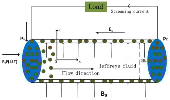 The radius of a circular microtube is R0 and the length is L (Assuming R0 ≪ L). The two ends of the microtube are linked by two reservoirs, which are assumed to be infinitely vast in relation to the size of the microtube. A cylindrical coordinate system with axis X is established at the center of the microtube. There is a pressure difference Δp = p1 − p2 between inlet and outlet. Viscoelastic nanofluids with Jeffreys fluid constitutive relation produce a uniform horizontal flow in the condition of the combined effect of evenly distributed magnetic field B0 in the r direction and a pressure gradient in the X direction flowing through a long circular microtube is considered for investigation. Fluids are considered unstable and unidirectional, which is considered as a symmetric (z:z) electrolyte, with z representing the valence of the electrolyte. At the same time, this is because of the chemical interaction between the electrolyte solution and the microtube wall forming an EDL at the solid–liquid interface. The excess free ions in the EDL migrate with the fluid, inducing a streaming current. Such currents can be applied to external electronic loads to achieve energy conversion and utilization. Furthermore, the movement of the fluid again causes the enhancement of the downstream potential of the microtube, forming a streaming potential opposite to the flow direction.