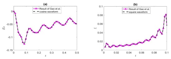 In this paper, the streaming potential and EKEC efficiency under the combined action of the axial pressure gradient and transverse magnetic field are investigated in the Jeffreys fluid model. It is worth noting that Gao et al. [55] performed a similar analysis to the current work, except that they assumed a Maxwell fluid. Where λ1 ≠ 0, λ2 ≠ 0, if we set λ1 = 0, the Jeffreys model in this paper becomes the Maxwell model. While keeping other parameters consistent, this paper compares the results of the existing study with that of Gao et al. [55] in Figure 2. Figure 2a is the comparison of the streaming potential under a cosine wave, and Figure 2b is the comparison of EKEC efficiency under the action of a square wave. It can be seen from Figure 2 that the streaming potential and the EKEC efficiency are basically consistent with the research results of Gao et al. [55].
