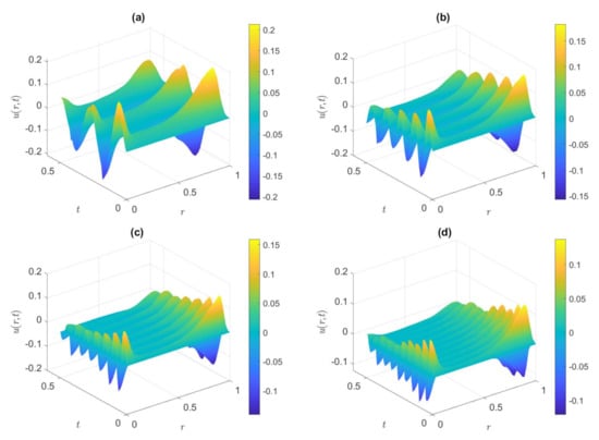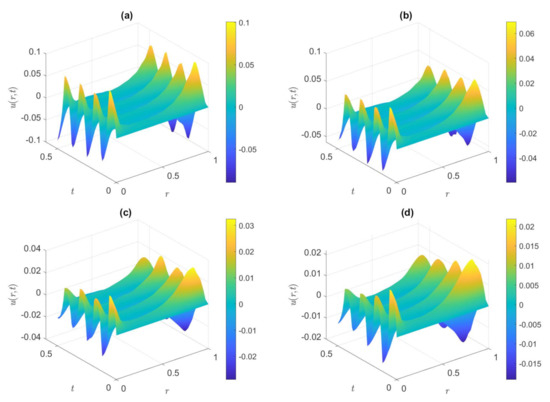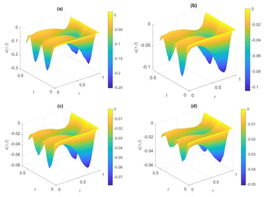 Figure 4 shows the variety of dimensionless velocity with dimensionless time under various values of the dimensionless frequencies of the triangular waveform. The values of dimensionless frequencies are 30, 60, 90, and 120, respectively. When the pressure gradient is a superimposed waveform, it can be seen from Figure 4 that the overall decrease of the dimensionless velocity is due to the increase of the dimensionless frequency. Results show that a larger dimensionless frequency is due to a lesser time period; meanwhile, the velocity spread time becomes shorter and the oscillation becomes quicker, the fluid movement cannot progressive sufficiently, and the fluid momentum does not have enough time to diffuse into the volume flow. As a result, the overall dimensionless velocity is decreasing. For a fixed ω, it can be seen that the dimensionless velocity on the surface of the microtubule wall is higher than that inside of the microtubule. The dissipation time scale is much larger than the vibration period, and the fluid velocity only changes near the two walls, so the fluid motion does not have enough time to diffuse to the plane in the middle of the microtube. It is also worth mentioning that the dimensionless axial velocity exhibits a simple harmonic motion with time.
