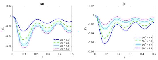 Figure 6b portrays an effect of the variation of dimensionless streaming potential of dimensionless time for several values of De* (De* = 0.5, 1.0, 3.0, and 5.5, respectively) in cosine waveform. In complete contrast to Figure 6a, the absolute value of the dimensionless streaming potential decreases due to the increase of value of De*, and the same thing is that it fluctuates up and down periodically over time. A cosine wave is the simplest periodic pressure gradient that drives the periodic motion of a fluid. However, due to the inhibitory effect of the retardation time, the velocity reduces with the increase of the retardation time, and the flow becomes slower and slower, which causes reduction in the absolute value of the streaming potential.