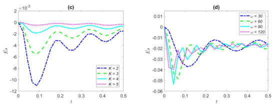 Figure 8d portrays the variation of the EKEC efficiency with dimensionless time for different dimensionless frequency. It can be clearly seen that the magnitude of EKEC efficiency increases with the increase of dimensionless frequency. The results show that the EKEC efficiency peaks first when the dimensionless ω increases. The reason is that, at high frequencies, the oscillation period shortens as the dimensionless ω increases. Therefore, EKEC efficiency at high frequencies (ω = 120) will be maximized preferentially. On the other hand, when the dimensionless ω decreases, the oscillation period increases and the time reaching the peak becomes too long.