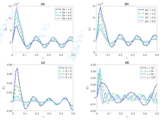 Effects of the dimensionless streaming potential of the triangular waveform for some values of De, De*, K, ω. (a) De* = 0.5, φ = 2%, ω = 45, Ha = 2, K = 2; (b) De = 6, φ = 2%, ω = 45, Ha = 2, K = 2; (c) De = 1, De* = 0.5, φ = 2%, ω = 50, Ha = 2; (d) De = 1, De* = 0.5, φ = 2%, Ha = 2, K = 3.
