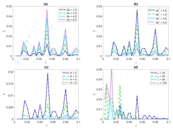 The EKEC efficiency variation for several Deborah number De with time under the triangular waveform in a microtube is portrayed in Figure 8a. De is set to set to 1.0, 2.5, 4.5, and 6.0, respectively. It can be seen from Figure 8a that the Deborah number De is straightforward for inducing the huge EKEC efficiency. Since the elasticity of the fluid becomes meaningful with the increase of the relaxation time, the EKEC efficiency amplitude likewise increases with the increase of the relaxation time. A longer relaxation time means a larger elastic effect and a smaller recovery capacity, resulting in larger velocity amplitude, which in turn leads to an increase in the EKEC efficiency. The elasticity of viscoelastic fluids has a great influence on electro-kinetic energy conversion.