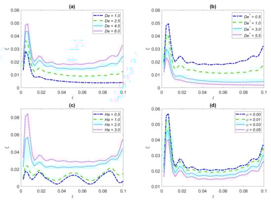We portray the variation of EKEC efficiency ξ with dimensionless time for different volume fractions of nanoparticles in the case of square waveform in Figure 9d. The φ is set to be 0.00, 0.02, 0.03, and 0.05, respectively. We can observe interestingly in Figure 9d that the range of the EKEC efficiency reduces as the value of the volume fraction of nanoparticles is enhanced. This is because the effective viscosity of the fluid can be improved with the increase of the volume fraction of nanoparticles. Nevertheless, an increase in the number of nanoparticles will undermine the velocity of the fluid, resulting in a reduction in streaming potential, which in turn leads to a decrease in EKEC efficiency. In addition, due to the periodic pressure gradient, the overall EKEC efficiency fluctuates with the passage of time.