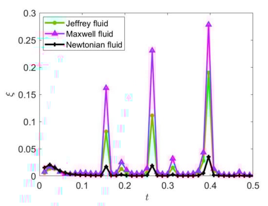 Figure 10 depicts the EKEC efficiency of ordinary Newtonian nanofluid (λ1 = λ2 = 0), Jeffreys nanofluid (λ1 ≠ 0, λ2 ≠ 0), and Maxwell nanofluid (λ1 ≠ 0, λ2 = 0) in microtube as a function of dimensionless time. In Figure 10, EKEC efficiency changes with time and the peak value becomes larger. Moreover, the EKEC efficiency of viscoelastic fluid is evidently superior to that of ordinary Newtonian fluid, which is due to the shear-thinning effect (higher fluidity). Due to the obstruction of retardation time in Jeffreys fluid, the EKEC efficiency of Maxwell fluid is superior to that with Jeffreys fluid. It can be noted that the viscoelastic fluid can greatly improve the EKEC efficiency compared with the Newtonian fluid. In summary, it is valuable to study the EKEC efficiency of viscoelastic fluids in a micro-electro-mechanical system.
