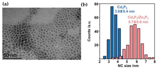 (a) TEM image of Cd3P2/Zn3P2 core-shell NCs. (b) Histograms of measured NC sizes for Cd3P2 cores and Cd3P2/Zn3P2 core-shell NCs.
