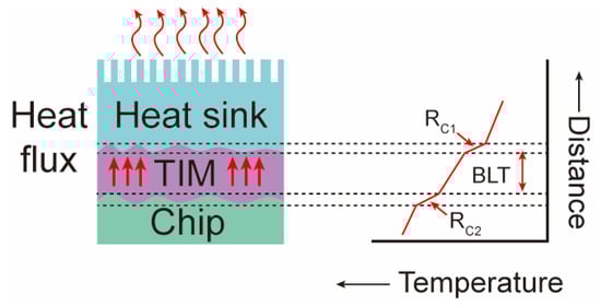 According to the schematic diagram of high-power electronics’ heat dissipation in Figure 2, the interfacial thermal resistance of TIMs (RTIM) can be shown as follows [23]: