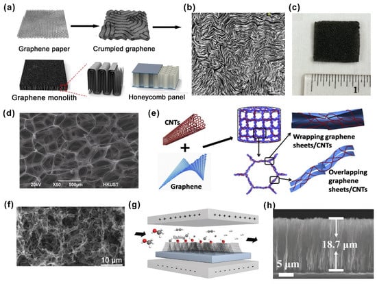 (a) The fabrication process for graphene monolith. (b) The top view SEM image of vertically aligned graphene sheets ((a,b) reprinted/adapted with permission from Ref. [81]. 2019, the American Chemical Society). (c) The picture of 3D graphene skeleton foam. (d) The SEM image that shows the 3D interconnected thermal pathways inside graphene foam ((c,d) reprinted/adapted with permission from Ref. [83]. 2014, Elsevier). (e) The method of super-elastic graphene–carbon nanotube aerogel. (f) The SEM image of as-prepared graphene–carbon nanotube aerogel ((e,f) reprinted/adapted with permission from Ref. [79]. 2016, Elsevier). (g) The growth of vertical graphene arrays using electrical field. (h) The cross-sectional SEM image of graphene arrays with a height of 18.7 µm ((g,h) reprinted/adapted with permission from Ref. [85]. 2020, Wiley).