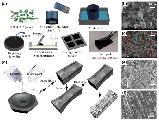 (a) The fabrication procedure for hybrid fillers incorporated into a PDMS matrix. (b) Pristine 2D graphite nanoplate filler. (c) The uniform dispersion of 2D graphite nanoplates with 1D silver nanowires with a 3D interconnected network in the PDMS matrix (Figure 5a–c reprinted/adapted with permission from Ref. [98]. 2020, Elsevier). (d) The mixing process for liquid metals with PDMS. (e,f) The micro/nanochannels of liquid metal inclusions formed with 10% and 50% deformation quantity (Figure 5d–f reprinted/adapted with permission from Ref. [99]. 2018, Royal Society of Chemistry).