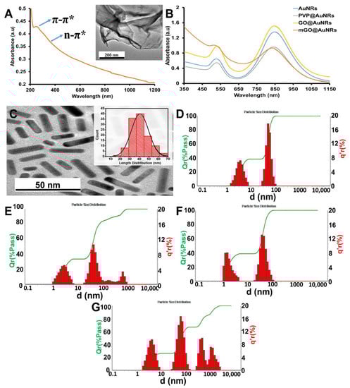 UV-Vis-NIR spectra of (A) GO (Inset: GO TEM image scale 200 nm) and (B) UV-Vis-NIR spectrum of AuNRs, PVP@AuNRs, GO@AuNRs, and mGO@AuNRs. (C) TEM image of AuNRs (inset: Size distribution, TEM image scale 100 nm). Hydrodynamic size distribution of (D) AuNRs, (E) GO@AuNRs, (F) PVP@AuNRs, and (G) mGO@AuNRs.