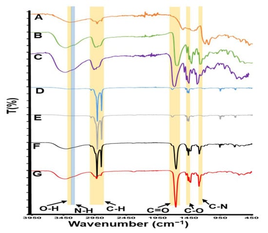 FTIR spectra of (A) GO, (B) PVP, (C) mGO, (D) AuNRs, (E) GO@AuNRs, (F) PVP @AuNRs, and (G) mGO@AuNRs.