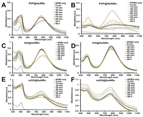 The coated AuNRs were also tested in RPMI and DPBS at a ratio of 1:1 and at different time intervals. The PVP@AuNRs in RPMI were slightly blue-shifted for the first 90 min and red-shifted after 24 h (Figure 4A). The blue-shifting could be attributed to the binding of PVP with the biomolecules. This exposed the AuNRs to the proteins present in the medium and their subsequent adsorption on the surface of AuNRs due to distinct binding affinities [43]. This adsorption resulted in the red-shifting absorption seen after 24 h. The same behaviour can be observed with the GO@AuNRs and mGO@AuNRs (Figure 4C,E). The samples behave differently in PBS, with PVP@AuNRs the most unstable composite when compared to the others (Figure 4B). The GO@AuNRs was the most stable with a slight reduction in absorbance after 48 h (Figure 4D). Though the mGO@AuNRs was also stable, however, the presence of PVP in the GO was attracting the biomolecules on the surface of the sheet, which affected the stability of AuNRs on the surface of the GO (Figure 4F). However, the presence of PVP is necessary to prevent the aggregation of AuNRs, which usually occurs when AuNRs is attached to bare GO (Figures S1A, S2 and S3). The stability of GO nanocomposite can be attributed to the GO, as it has been described as preventing the protein from absorbing in physiological environments [44].
