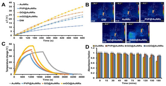 (A) Photothermal response of water, AuNRs, PVP@AuNRs, GO@AuNRs, and mGO@AuNRs after irradiation with laser at 1.27 W.cm−2 for 10 min. (B) Thermal IR images of water, AuNRs, PVP@AuNRs, GO@AuNRs, and mGO@AuNRs after irradiation with laser at 1.27 W.cm−2 for 10 min. (C) Temperature profile generated by AuNRs, PVP @AuNRs, GO@AuNRs, and mGO@AuNRs after irradiation with 808 nm laser at 1.27 W.cm−2 (D) LSPR absorbance fraction after 70 °C incubation of AuNRs, PVP@AuNRs, GO@AuNRs, and mGO@AuNRs at different times (0, 15, 30, 60, 75, 90, 120, 150, and 180 min) intervals.