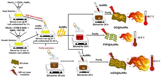 Schematic diagram of the synthesis and photothermal profiling of AuNRs, PVP@AuNRs, GO@AuNRs, and mGO@AuNRs.