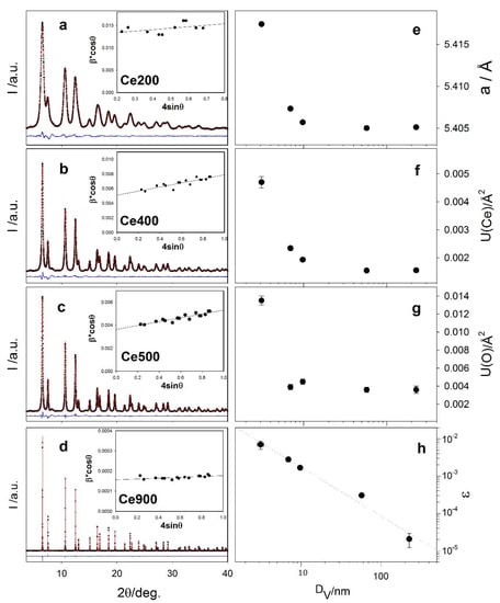 Experimental XRPD patterns (black dots), best fits of Rietveld analysis (red curves) and residuals (blue curves) collected on samples Ce200, Ce400, Ce500 and Ce900 (panels (a–d)). The WH analysis of the same patterns is included in the insets. Selected refined parameters of the Rietveld refinements are reported in panels (e) (cell parameter) and (f,g) (Ce and O displacement parameters) as a function of the crystallite dimension DV. Panel (h) shows the trend of strain versus DV according to WH analysis results.