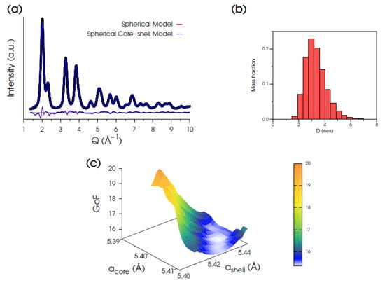 The best fit (Figure 3a) was obtained using a bi-layer prismatic core-shell model exposing {011} and {100} facets (in cubic notation, Figure 3d), providing mass-averaged sizes: <La>M = 3.26 nm, <Lb>M = 2.31 nm, and <Lc>M = 3.28 nm and relative dispersion σ/<La>M = σ/<Lb>M = 0.31; σ/<Lc>M = 0.41 (Figure 3b). The best acore = 5.386 Å and ashell = 5.424 Å lattice parameters were achieved, once more using a grid search algorithm (the 3D hypersurface is shown in Figure 3c). The final match of the calculated vs. experimental pattern is largely improved by this model, as witnessed by the significantly lower statistical indicators (Rwp = 4.32%, GoF = 10.94) favoring the core-shell structure vs. the uniform prismatic one of identical morphology/faceting of NPs (GoF = 12.35). The relative shell-to-core expansion is 0.72%. This finding is in agreement with the presence of Ce3+ species preferentially located at the NP surface, in line with previous reports [,,].