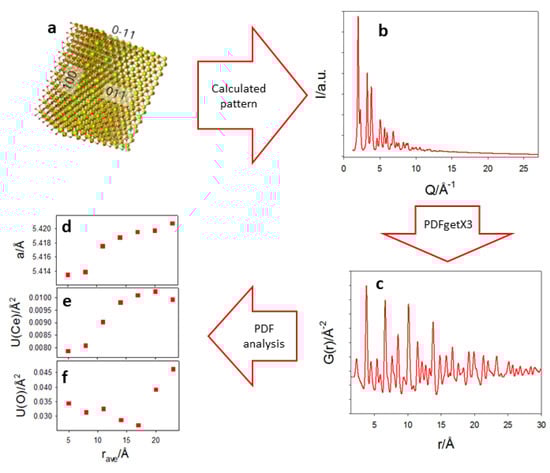The prismatic core-shell model refined by DSE (a) produced a calculated pattern (b) that was normalized and Fast Fourier Transformed to obtain the PDF function displayed in (c). The G(r) was fitted using a box-car strategy. Refined cell parameter, U(Ce) and U(O) are displayed in (d–f).